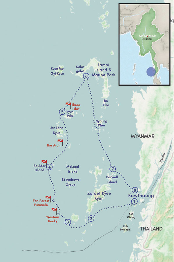 Embark on a journey to an unexplored world, a hidden gem in the southern part of Myanmar – the Mergui Archipelago. Immerse yourself in the beauty of pristine tropical paradise and discover its spectacular biodiversity. With the majority of Myanmar’s coral reef and well-preserved mangrove forests and seagrass meadows, the Mergui Archipelago is of high importance to marine and coastal conservation. Our tour offers more than just a classic live aboard sail – it is a spirit of adventure, relaxation, and shared experiences aboard a luxurious, fully crewed sailing yacht. Qualified divers will have an unforgettable week at sea, enjoying adventurous moments while discovering the untouched wonders of this magical destination.